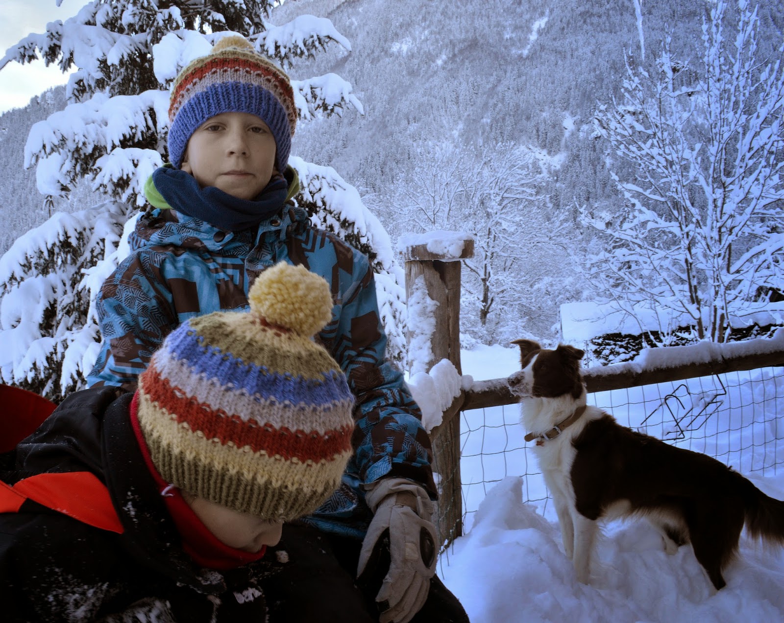 The mountain behind the boys is La Prarion, it's a great snowshoeing itinerary, but as it finishes on a fairly exposed ridge I've no plans to take the kids there just yet!